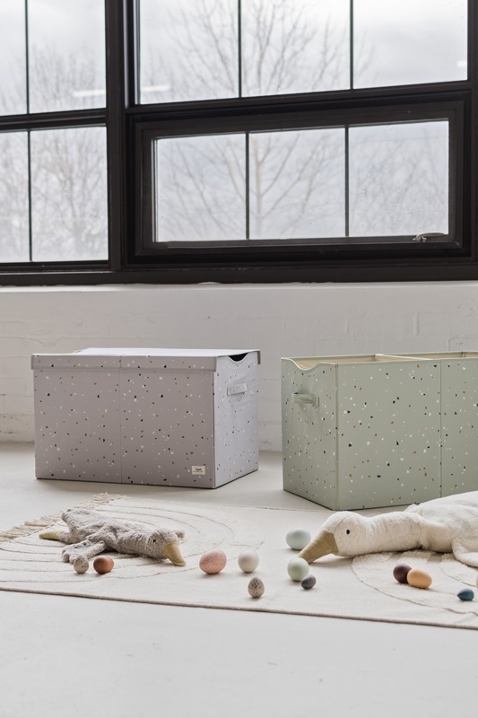 TIP: Pudełko na zabawki Recycled Terrazzo o wzorze w lastryko doskonale komponuje się z gładkimi pudełkami z serii Solid, a także z pudełkami z motywem zwierzątek.