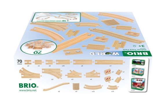 Rozbuduj swoje zestawy kolejowe BRIO World o zestaw torów Deluxe. Ten pakiet rozszerzeń torów kolejowych jest pełen różnych drewnianych elementów i daje dzieciom możliwość budowania wszelkiego rodzaju układów — od podstawowego kołowego po skomplikowane projekty rozciągające się na różnych wysokościach. Użyj kombinacji prostych, łuków, zwrotnic, przystanków, ramp, torów wznoszących i podpór, aby wymyślić własne ścieżki dla pociągów lub po prostu postępuj zgodnie z zawartymi sugestiami dotyczącymi układu.