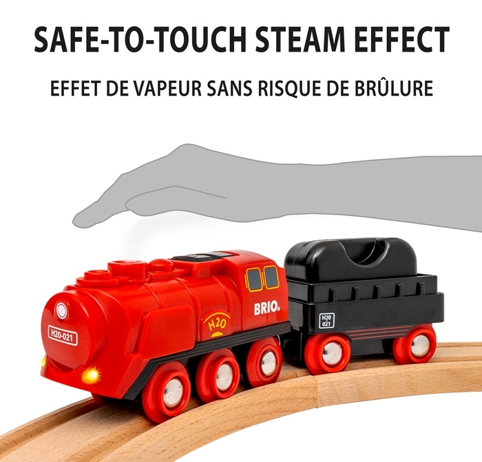 Kolejka którą znajdziesz w zestawie to niesamowity model, który faktycznie wypuszcza parę! Wystarczy wlać do niej wodę oraz wcisnąć przycisk. Dzięki specjalnemu silniczkowi zasilanego bateriami od razu pojawia się para wodna, przypominająca tę prawdziwą :)