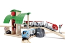 Przesiadaj się z jednego pociągu do drugiego podczas zabawy Zestawem kolejowym z dworcem BRIO World. Wsiądź do akumulatorowego niebieskiego pociągu i ruszaj w drogę przez most do nowoczesnego dworca kolejowego. Skorzystaj z windy i wjedź nią na peron, z którego odjeżdża Twój pociąg ! Maszynista może przełączać tory za pomocą ręcznych przełączników. To proste!