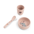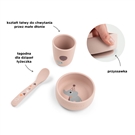 Rozmiar naczyń został dostosowany do potrzeb najmłodszych, wszystkie elementy zaprojektowano tak, by były łatwe do chwytania przez małe rączki. Zaokrąglone wewnętrzne krawędzie miseczki dla dziecka ułatwiają nabieranie posiłku, a przyssawka przytrzymują miseczkę w miejscu, dzięki czemu doskonale sprawdzi się ona do nauki samodzielnego jedzenia. Lekki i poręczny kubek zachęca dziecko do picia napojów, a niewielka łyżeczka została zaprojektowana z myślą o dzieciach, które dopiero rozpoczynają naukę samodzielnego. Łyżeczka idealnie wpasowuje się w małe rączki dzieci zapewniając im wygodę i komfort podczas posiłku.