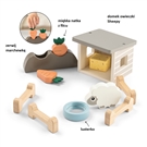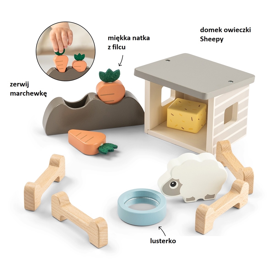 - 11 elementów: domek, krzaczek, dwie marchewki, belka siana, owieczka Sheepy, lusterko imitujące zbiornik wodny, cztery elementy ogrodzenia,