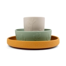 Zestaw obiadowy dla dzieci Done by Deer składa się z silikonowych naczyń: talerzyka z przyssawką, miseczki z przyssawką oraz poręcznego kubka. Wytłoczone wzory przyjaciół Done by Deer -lamy Lalee, ptaszka Birdee zachęcają malucha do zjedzenia posiłku.