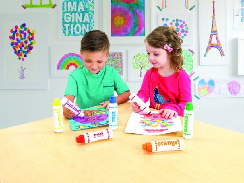 Duże Flamastry Kropkowe Do-A-Dot Art to wyjątkowe narzędzie do twórczej zabawy dla najmłodszych. Zawierają zmywalną farbę w płynie w dużej butelce dopasowanej do dziecięcych rączek, zakończonej miękką, opatentowaną gąbeczką, która nie wysycha i zawsze pozostawia idealną kropkę. Farba jest nietoksyczna, szybko schnąca, intensywna w kolorach i nie rozlewa się ani nie pryska.