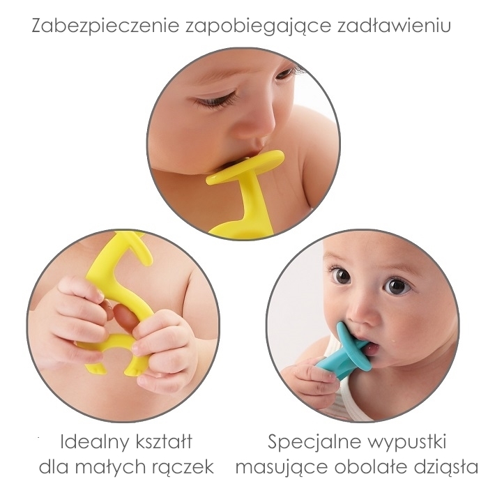 - miękki gryzak silikonowy z wypustkami masującymi dziąsła,