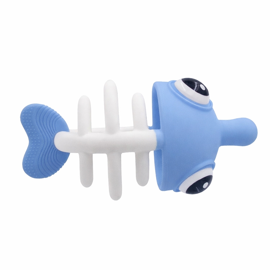 Oryginalny, zabawny i funkcjonalny silikonowy gryzak dla niemowlaka Rybka pełniący 3 różne funkcje: smoczka, gryzaka i zabawki sensorycznej. Idealny towarzysz dziecka podczas ząbkowania!