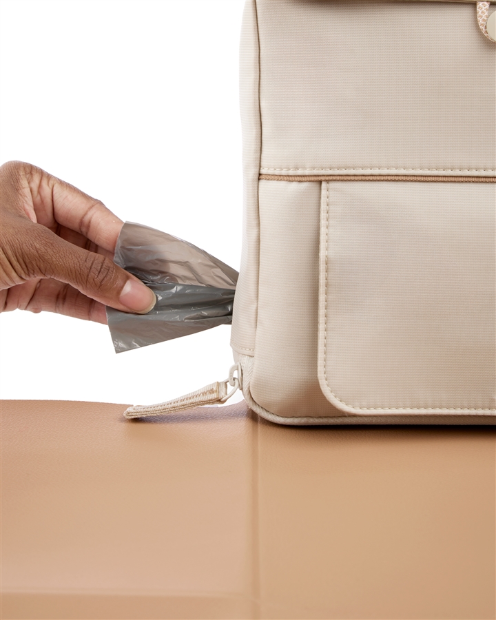 Wbudowana kieszeń na chusteczki, dozownik na woreczki jednorazowe oraz miejsce na pieluszki i niezbędne akcesoria zapewniają wygodę i porządek. Dodatkowe sprawiają, że ta stacja przewijania to must-have dla rodziców w podróży, na zakupach czy spacerze