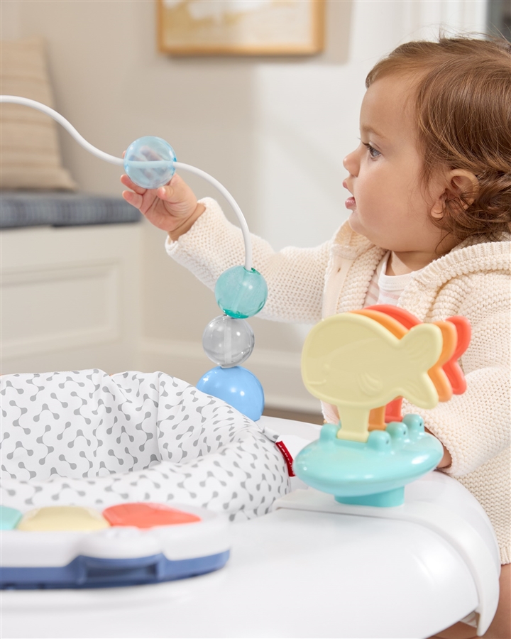 Centrum posiada 4 poziomy regulacji wysokości, a ruchome zabawki - grzechotka krab, „klaszczące” rybki i przesuwane koraliki - zachęcają dziecko do odkrywania i aktywnej zabawy.