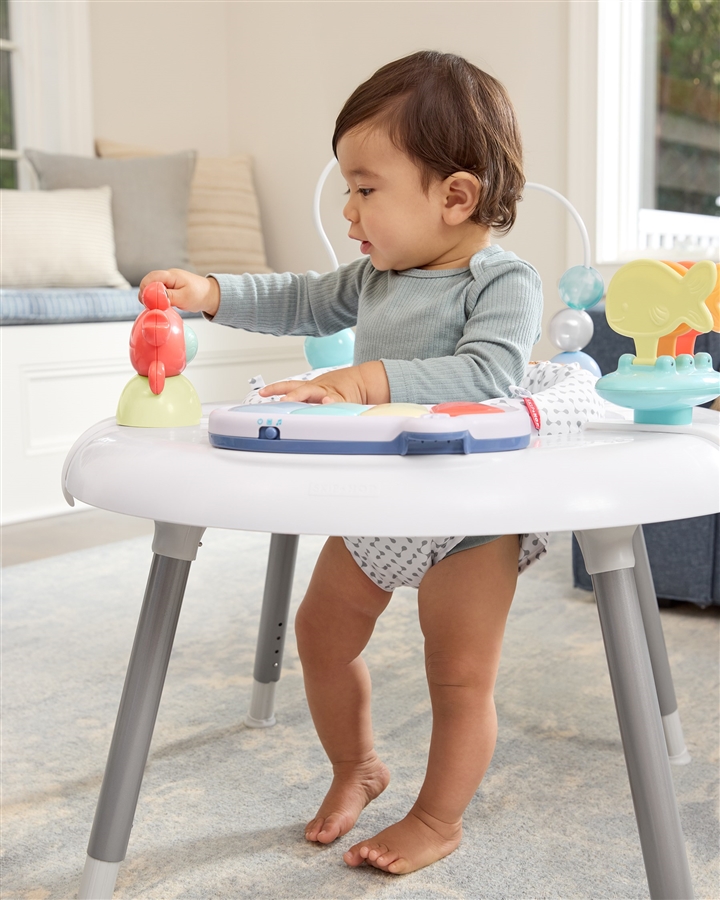 Interaktywne centrum aktywności dla niemowląt inspirowane podwodnym światem rośnie razem z dzieckiem i oferuje 2 etapy zabawy. W pierwszym etapie maluch siedzi w obrotowym 360° siedzisku, odkrywając kolorowe zabawki, dźwięki i świecące pianinko muzyczne. W drugim etapie centrum zmienia się w przestrzeń do nauki poruszania się i eksplorowania.