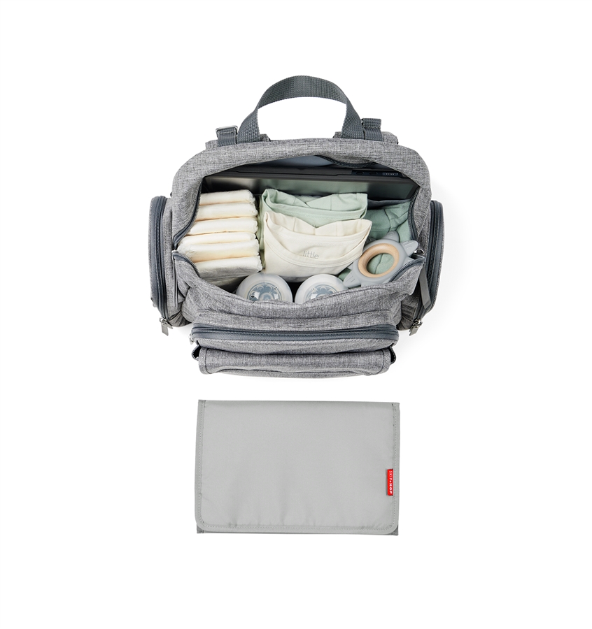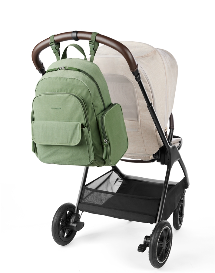 Dzięki 9 funkcjonalnym kieszeniom bez problemu uporządkujesz pieluszki, chusteczki, butelki czy przekąski. Plecak posiada także kieszeń na chusteczki nawilżane, uchwyty do wózka oraz pasek do mocowania na walizce, co sprawia, że świetnie sprawdzi się również w podróży.
