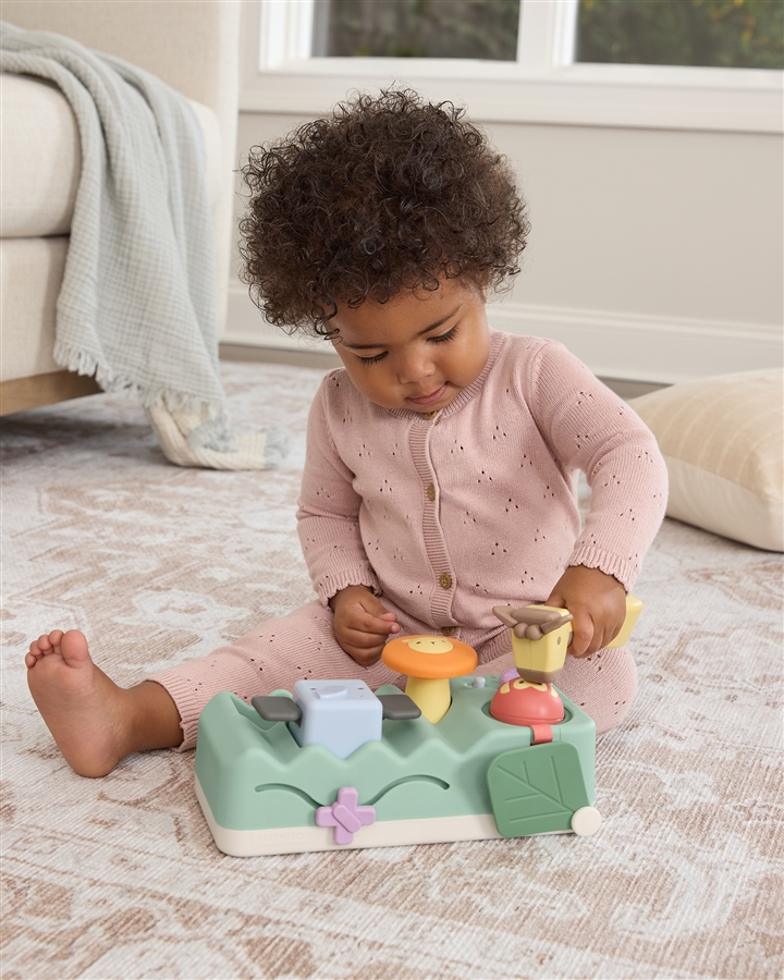 - zabawki edukacyjne: młoteczek w kształcie żyrafy z miękkimi uszami i nosem, podświetlany talerz w kształcie lwa, bęben bongo w kształcie słonia, muzyczny ptak, grzechotka-małpka, liść do zabawy w chowanego, suwak z motylem,