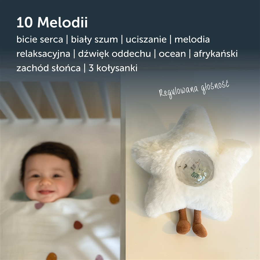 - reaguje na płacz – włącza światło i dźwięk, gdy dziecko się obudzi,